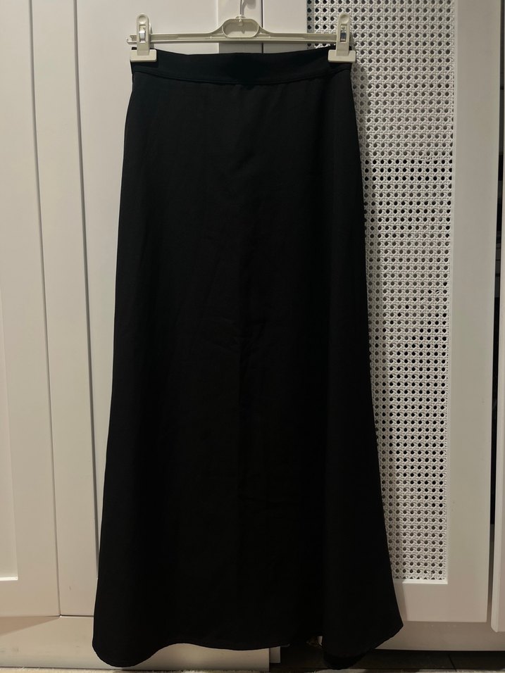 Siyah uzun dökümlü etek, sentetik kumaştan yapılmış ve bol kesimlidir. Hiç giyilmedi. Temiz bir üründür