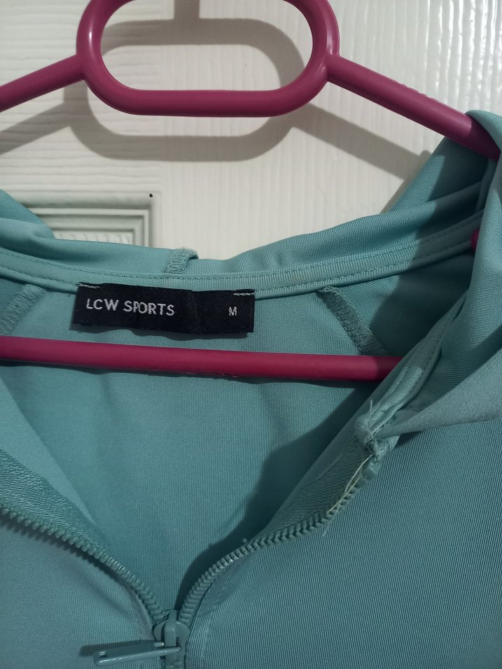 LCW SPORTS markalı, sentetik kumaştan yapılmış, turkuaz renkli, baskılı, V yaka ve fermuarlı kısa kollu, dar kesim spor üst. ♀️