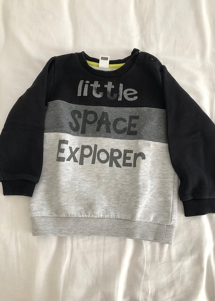 18-24 ay gri siyah penye sweat. Herhangi bir deformasyonu yoktur. Temiz kullanılmıştır.