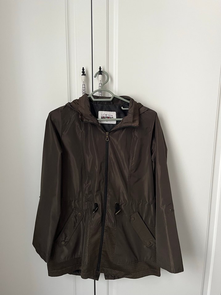 Az kullanılmıştır. Defosu yoktur. Kahverengi, kapüşonlu ve kemerli kadın yağmurluğu. Uzun kollu, bol kesim ve sentetik kumaştan, sokak stili ve dış mekan için uygun. ️