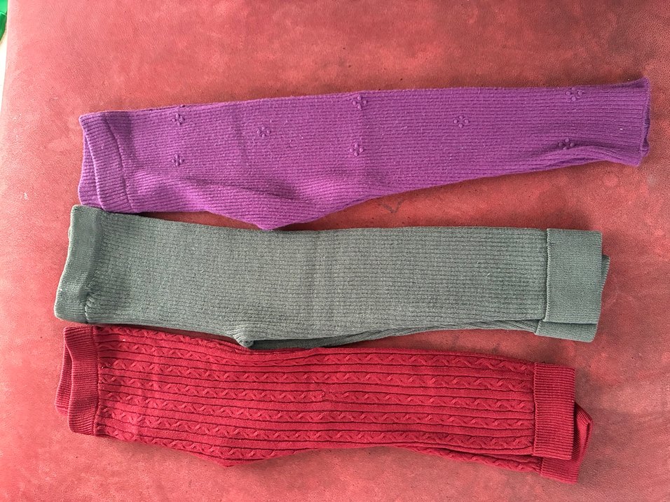 Yumuşak tekstil malzemeden yapılmış, gri, mor ve kırmızı renklerde triko taytlar. Kırmızı ve gri taytın bedeni 3-4 yaş mor olan 4-5 yaş. Mor olanın bir dizinde tülerme var. Gri olanın bir bacağının arka kısmında ip atmış ama sökülme yoktur. Kırmızı olanda da ufak sökülme vardı ama diktiğim için renk farklılığı çok dikkatli bakıldığında fark ediliyor