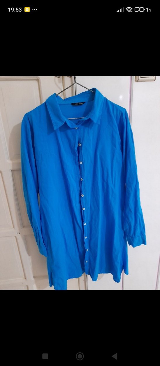 Düğmeli, uzun kollu, yakalı, mavi gömlek. Rahat kesimi ve günlük gıyme stiline uygundur. 1 kere gıyıldı 1 kere yıkandı olculer fotograftadır
