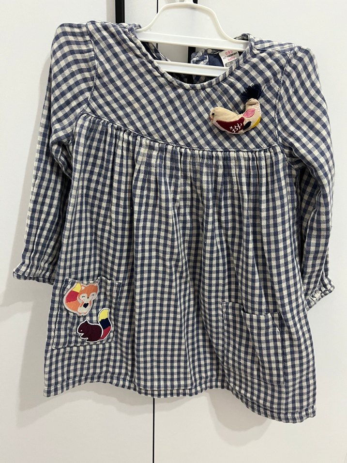 18-24 aylık için Uzun kollu, düğmeli ve kuş ve kedi işlemeli detaylara sahip bol kesim kız elbisesi. Lacivert kareli deseniyle rahat ve bohem tarzda tasarlanmıştır.