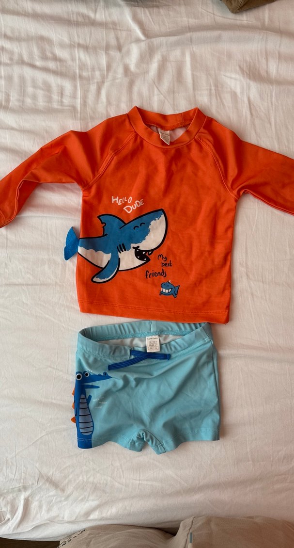şort beden: 12-18 ay tshirt beden: 9-12 ay Uzun kollu turuncu üstünde köpekbalığı baskısı ve açık mavi timsah desenli şorttan oluşan renkli erkek çocuk mayo takımı. Üstte "Hello Dude" ve "My best friends" yazıları bulunur.