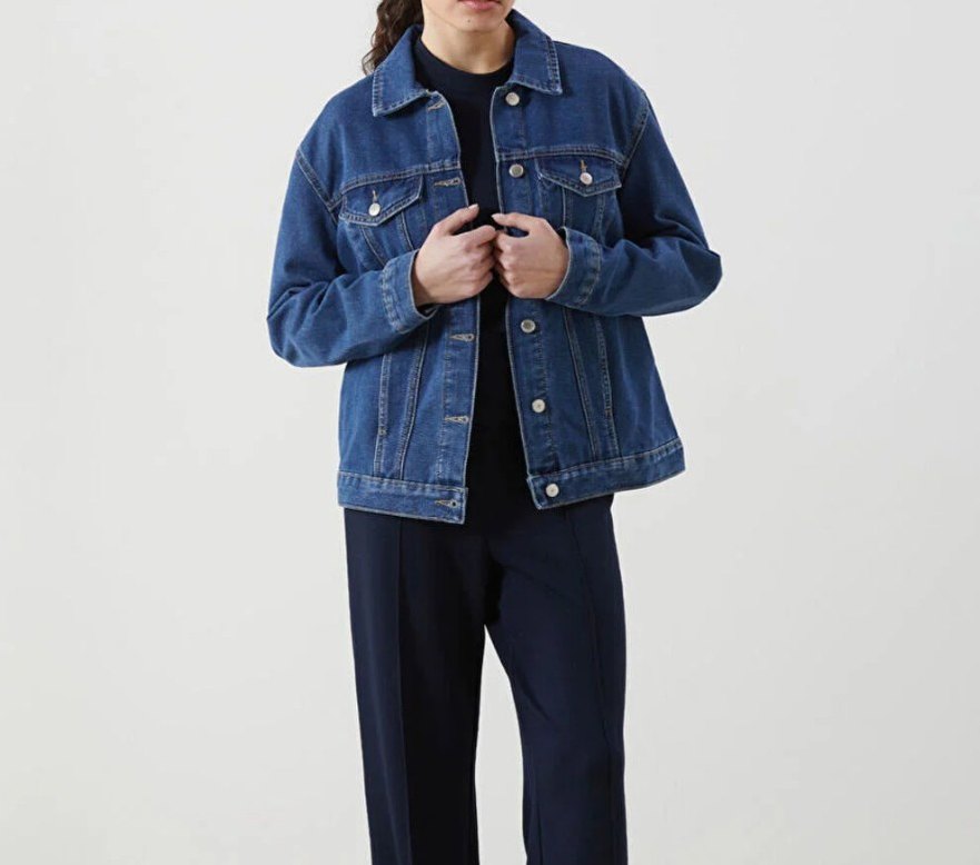Kadın lacivert denim ceket, rahat kesim, uzun kollu ve kesik yakalıdır. Günlük kullanıma uygun, zahmetsiz şıklık sunar.