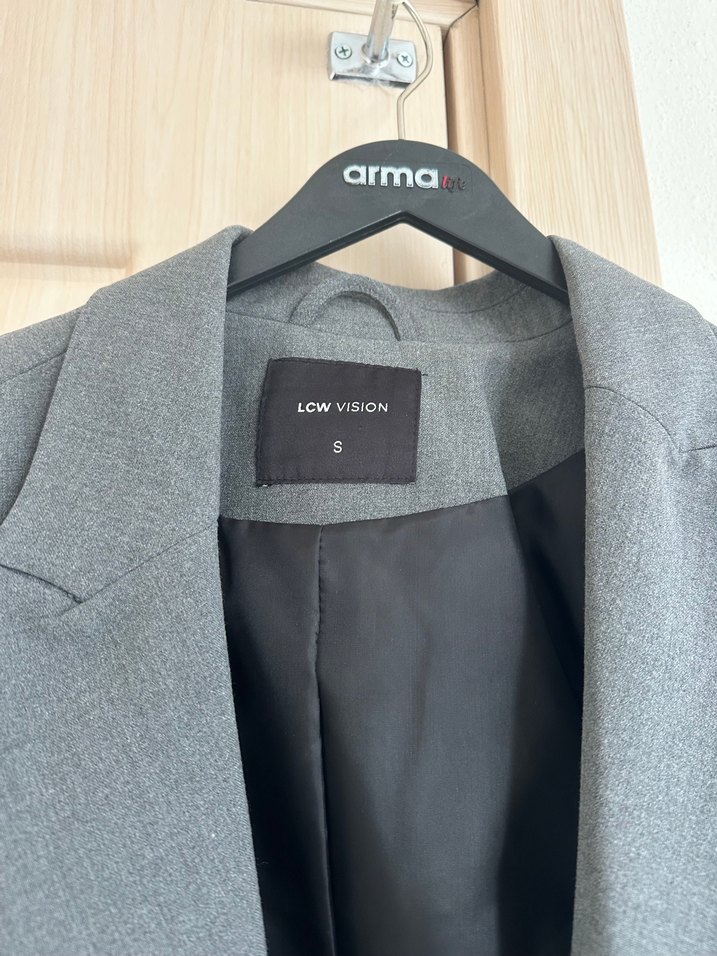 LCW Vision markalı, düğmeli, kesik yakalı, baskılı keten kumaştan gri kadın blazer ceket. Uzun kollu ve midi boyda, ofis için uygun.