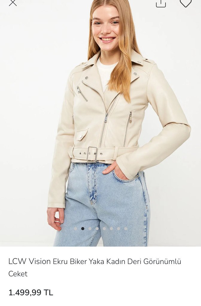 LCW Vision kadın ceketi, ekru deri görünümlü kumaştan, biker yaka ve uzun kollu. Normal kesim ve kemerli bel detayı ile günlük kullanıma uygun şık bir model. Bir kez giyildi hiçbir kusuru yoktur krem bej tonlarındadır