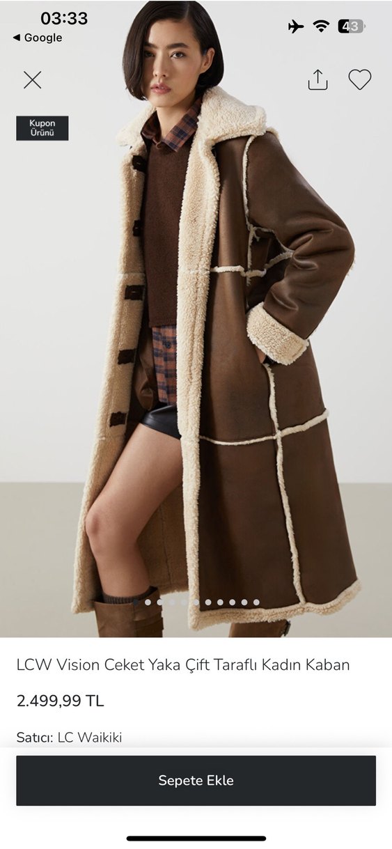 Uzun kahverengi deri kaban, gevşek kesim ve yaka, manşetler ile dikişlerde kürk detayları bulunur. Askılı kollu, deseniz ve çift taraflıdır. Rahat sokak stili sağlar.