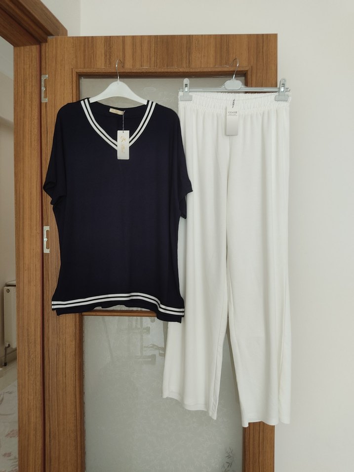 Kadınlar için rahat kesim, kısa kollu koyu üst ve beyaz pantolonlu takımı, konforlu ve sade tarzda viskon penye kumaş 44 46 bedene uyumludur