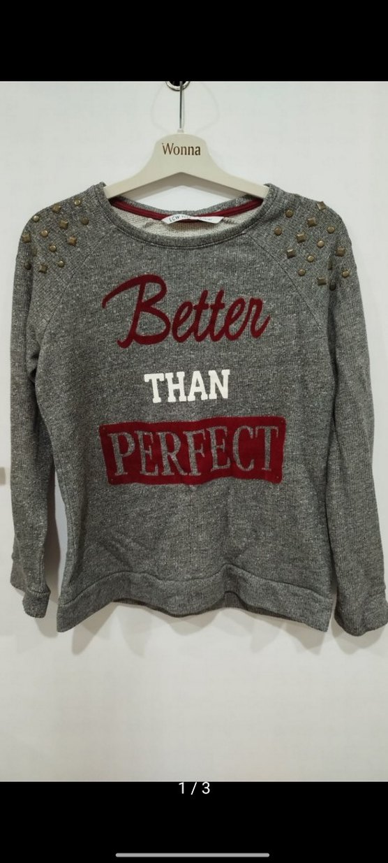 Düğmeli omuz detaylı, baskılı "Better Than Perfect" sloganlı, uzun kollu, gri triko kumaştan, normal boyda, dar kesim sweatshirt.Sıfır gibi çok az giyildi. Boy:59/ İki Koltuk Arası: 44 cm