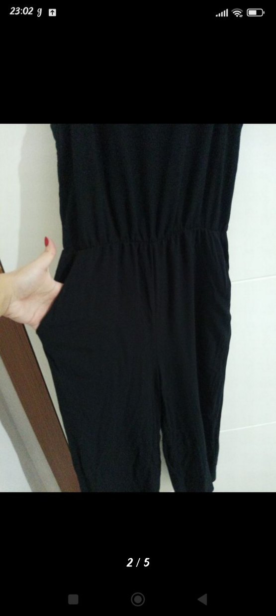 Siyah renkli, V yaka ve ince askılı, bacakta yırtmaçlı, vücuda oturan kadın tulumu. Günlük kullanıma uygun, sentetik dokulu kumaştan yapılmıştır.