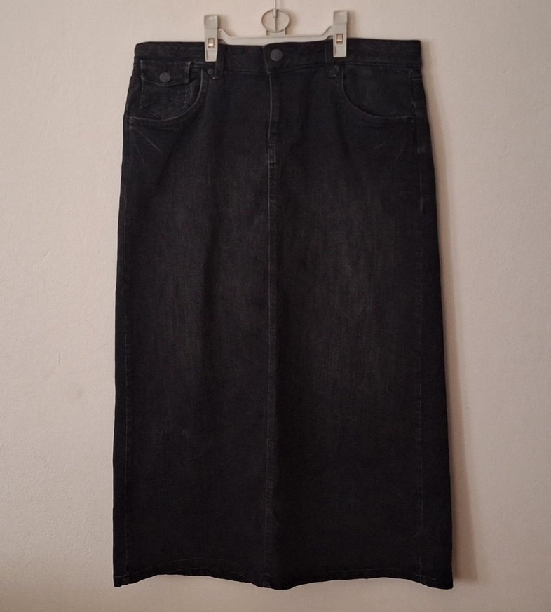 Siyah midi uzunluğunda, bol kesim, denim kumaştan yapılmış kadın eteği, günlük kullanıma uygun rahat ve şık görünümlü.Arka ve ön küçük cep kargo model .Boy 86 cm, bel 44 cm.