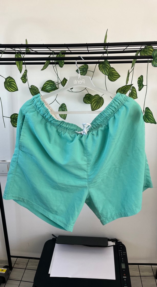 Düğmeli, bol kesim, pastel yeşil erkek mini şort. Plaj ve athleisure tarzına uygun, rahat ve sade bir model.