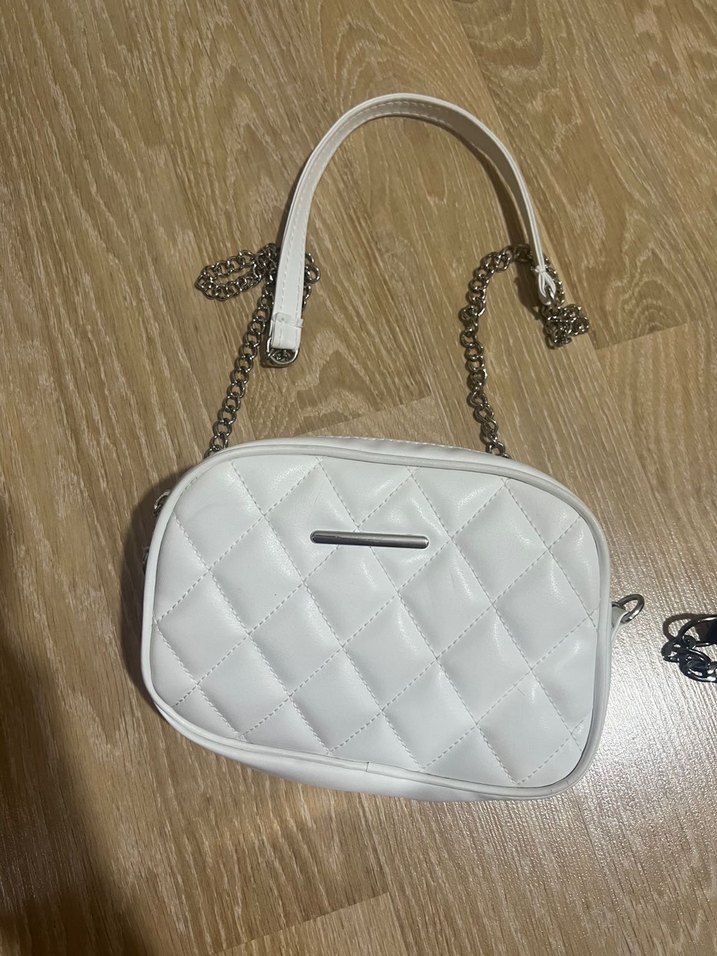 Beyaz deriden yapılmış, zincir detaylı ve kapitone desenli kadın çanta hiç kullanılmamıştır