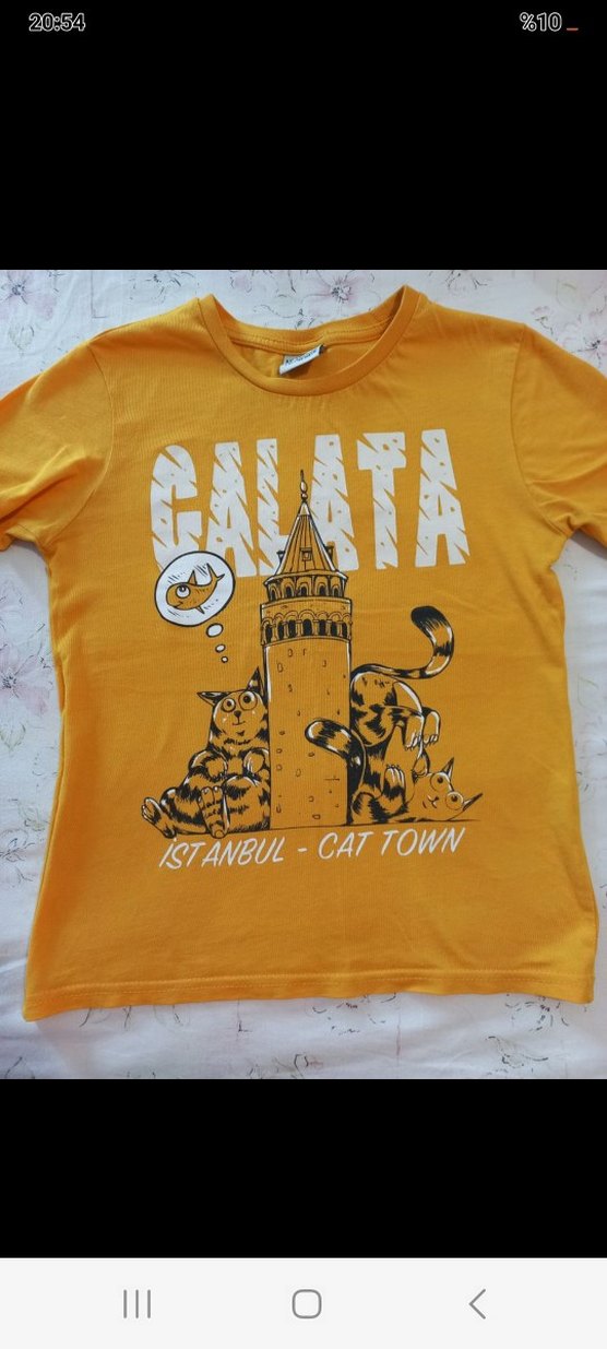Pamuklu sarı erkek çocuk tişörtü, Galata Kulesi ve kediler baskılı, bol kesim ve yuvarlak yaka ile rahat sokak stili sunar.