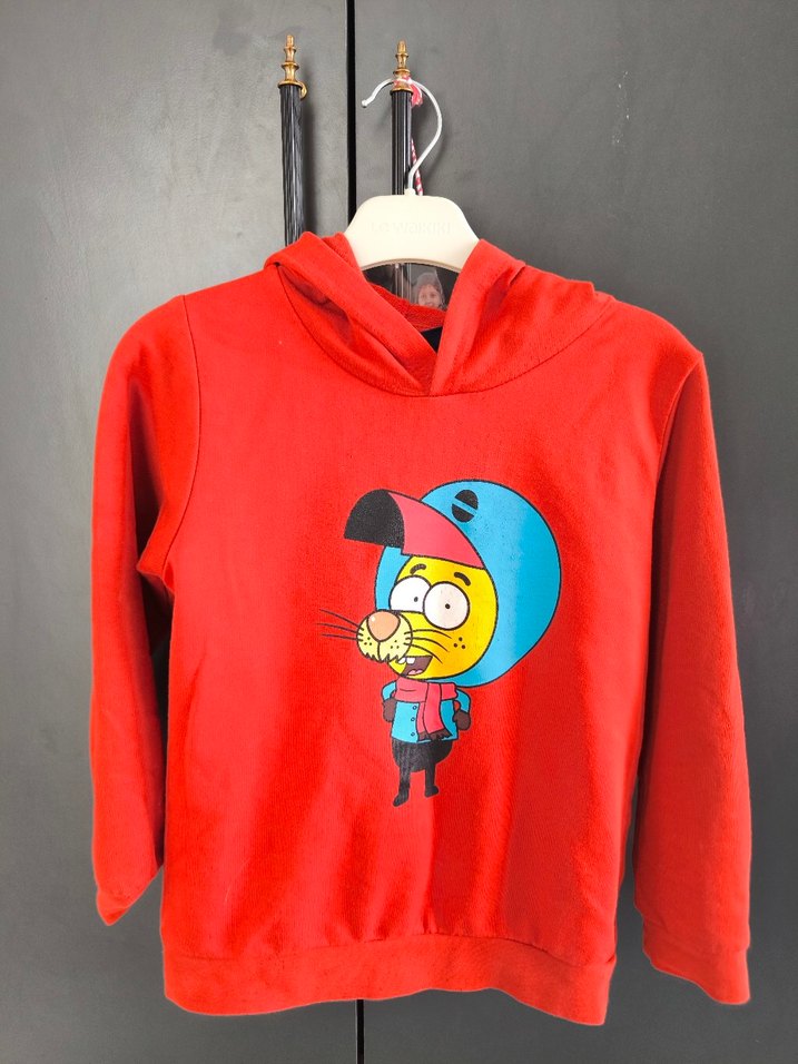 Erkek çocuk için kapüşonlu, uzun kollu ve bol kesim bir sweatshirt. Yumuşak ve sıcak kumaştan, kırmızı renkte, önünde renkli baskılı karakter temiz kullanıldı üründe herhangi bir sıkıntı yok 5-6 yaş