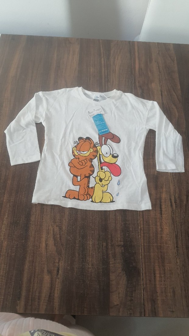 Beyaz renkli, uzun kollu ve bol kesim olan bu çocuk tişörtü, yumuşak ve sıcak kumaştan üretilmiştir. Üzerinde Garfield ve köpek baskısı bulunmaktadır.