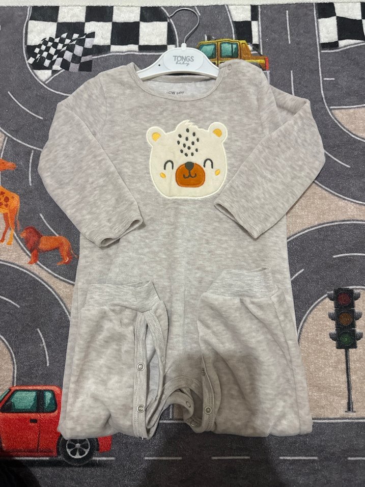 Hediye gelmişti hiç giyilmedi yıkanmadı bile Gri renkli, uzun kollu, yuvarlak yakalı, yumuşak örme kumaştan yapılmış bebek tulumu. Önünde baskılı ayı deseni ve kolay giydirme için çıtçıtlı bacak kısmı bulunur.