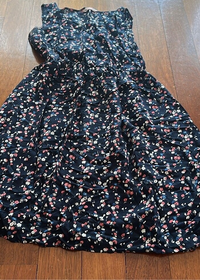 Lacivert çiçek desenli, beli lastikli, arkadan bağlama detaylı, sıfır yaka, kolsuz, günlük kullanıma uygun, tiril tiril bir hamile elbisesi