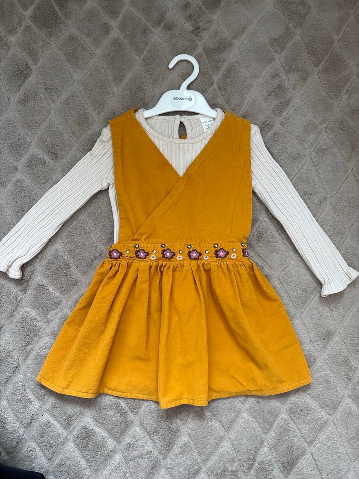 Sarı renkli, kemerli ve nakışlı çiçek detaylı, askısız, bol kesim bohem tarzda kız elbisesi. İnce fitilli kadife elbisesi ve ince fitilli bodysi ile takım. Çok rahat kullanımı var ve çok şık. 12-18 ay , 3 kez belki giydirdim başka kullanılmadı. Hiç bir kusuru defosu yok.