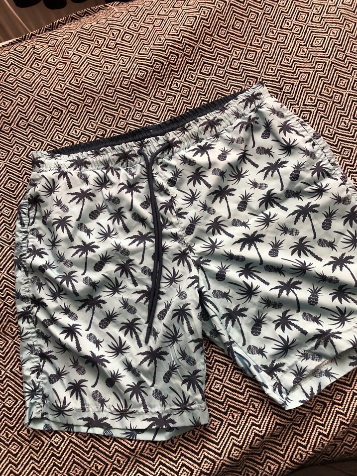 Mavi renkli, bol kesim erkek plaj şortu, palmiye ve ananas desenli, pileli detaylara sahip. boy 44 bel 43 lastikli ayarlanabilir