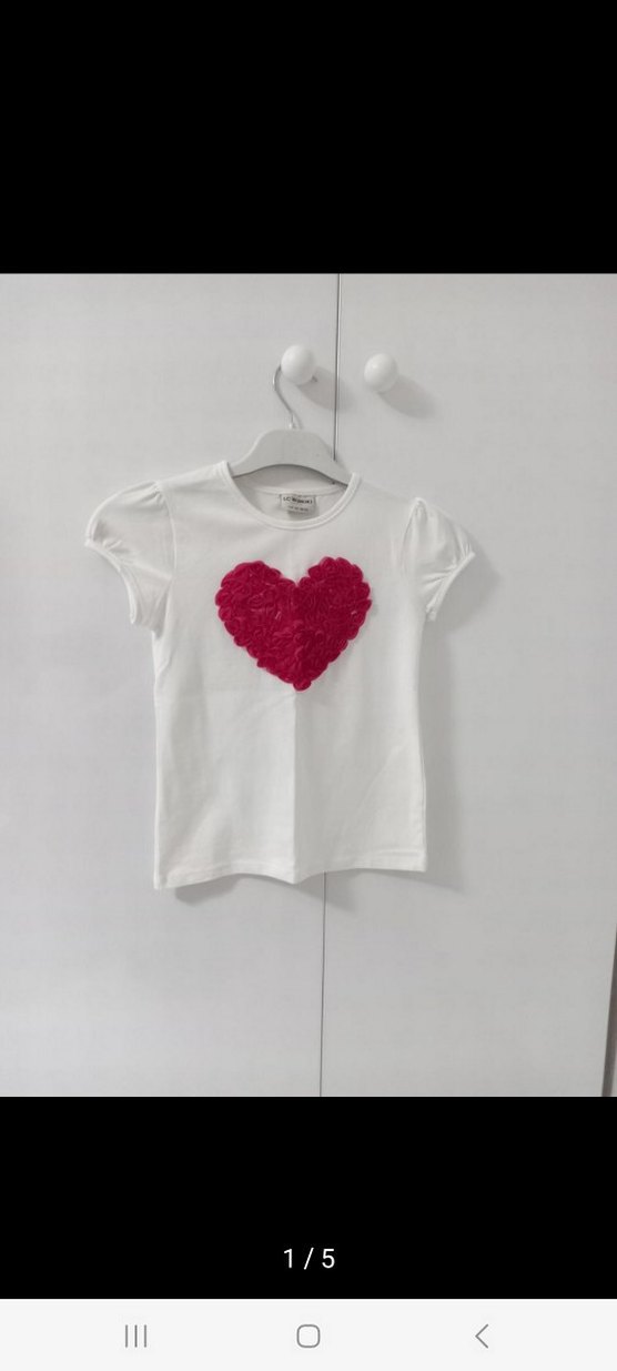 Pamuklu beyaz, kısa kollu kız çocuk tişörtü, fırfır detaylı kollara ve önünde kırmızı kalp baskısına sahiptir. Street wear tarzında, vücuda oturan kesim ve narcicegi rengi tshirt 7-8 yaş için