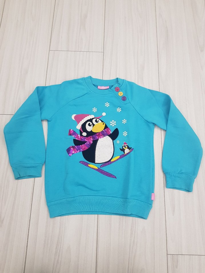Turkuaz renkli, baskılı penguen desenli kız sweatshirtü. Yuvarlak yaka, uzun kollu ve bol kesim. Yumuşak ve sıcak kumaştan, örme detaylı. ❄️