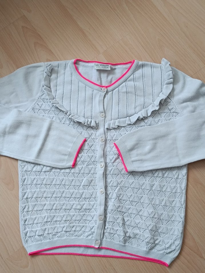 Uzun kollu, gevşek kesim gri triko kız hırka. İnce örme deseni, fırfır detayları ve pembe kenar süslemeleri bulunur. Rahat ve sade tarzda.Tekliflere acigim