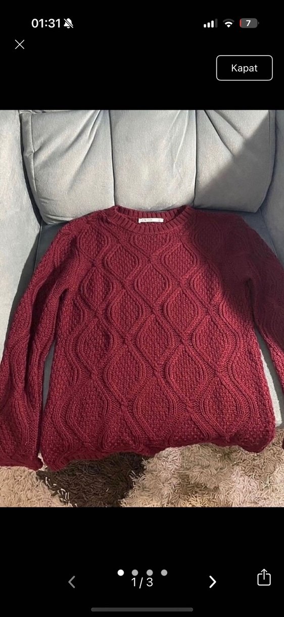 s-m olur Bordo renkli, örgü dokulu, uzun kollu ve yuvarlak yaka kadın kazağı, bohem tarzıyla rahat kullanım sunar.