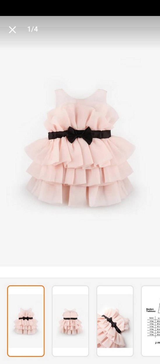Pudra renkli, tül askılı ve kat kat fırfırlı kız çocuk elbisesi, siyah fiyonk kemerle tamamlanmıştır. Dışı yumuşak organze kumaştan, içi pamuk kumaştan üretilmiştir. 2-3 yaş için uygundur.