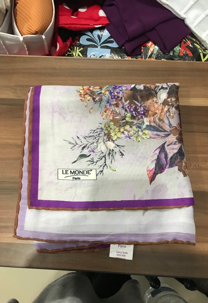 Le Monde Paris markalı, hafif mor zeminli, çiçek desenli ve ipek dokulu, bohem tarzda drapeli fular. Üzerinde 'LE MONDE' logosu bulunur. HİÇ TAKILMADI MAĞAZAYI KAPATIYORUZ