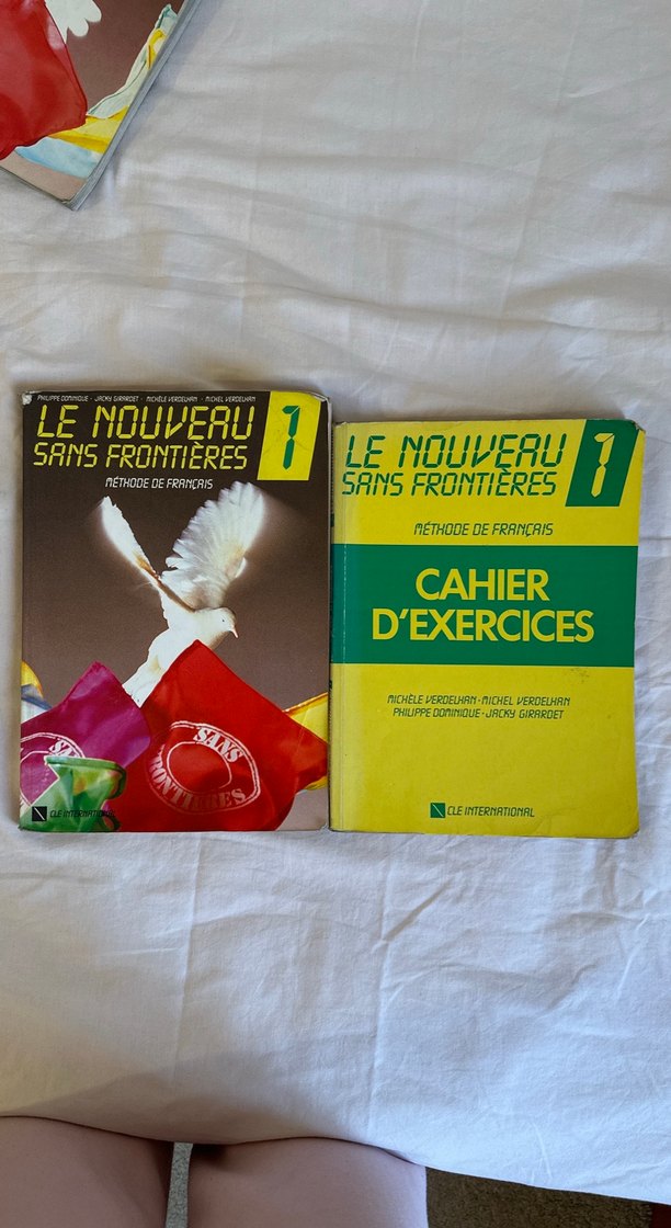 Le Nouveau Sans Frontières 1 adlı iki Fransızca öğrenme kitabı seti. Biri ders kitabı, diğeri alıştırma kitabı, Fransızca öğrenimini destekler.