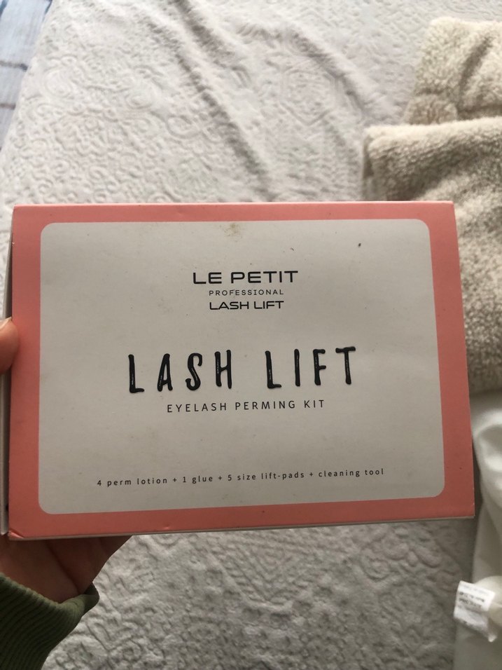 Le Petit kirpik kaldırma seti, permlotion, yapıştırıcı, 5 boy lift pedi ve temizlik aracı içerir. Pastel bej kutuda sunulmuştur.
