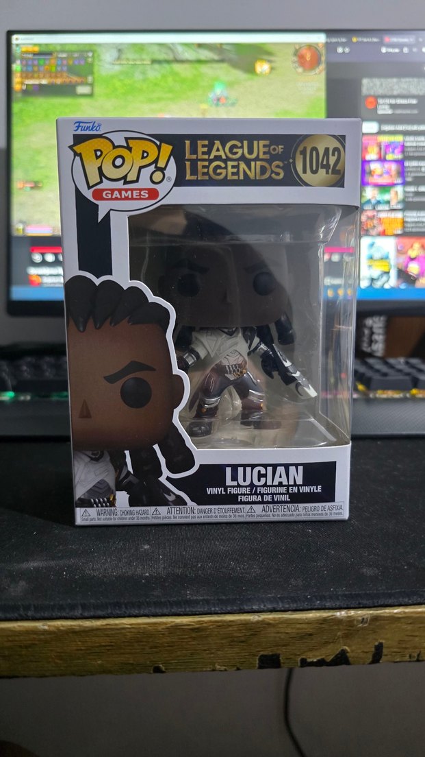League of Legends oyunu karakteri Lucian'ın siyah temalı vinil figürü, orijinal Funko Pop kutusunda bulunuyor.