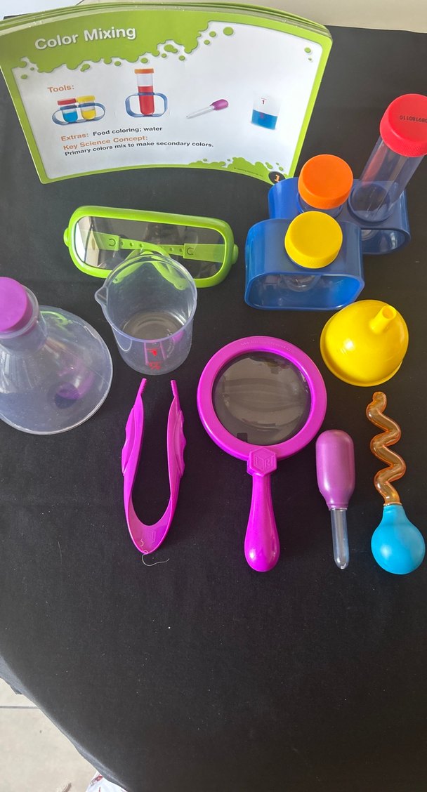 Çocuklar için büyüteç, cımbız, ölçü kabı, huni ve deney araçları içeren renkli bilim seti. Yurtdışı ürünüdür.10 adet deney ve deney tarifleri mevcuttur.Hiçbir sorunu yoktur, hiç kullanılmıştır.