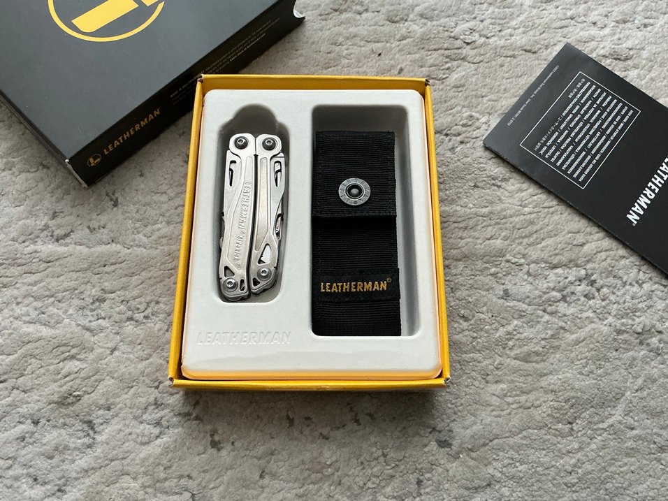 Leatherman çok fonksiyonlu alet, katlanabilir tasarıma sahiptir ve siyah taşıma kılıfı ile birlikte gelir.