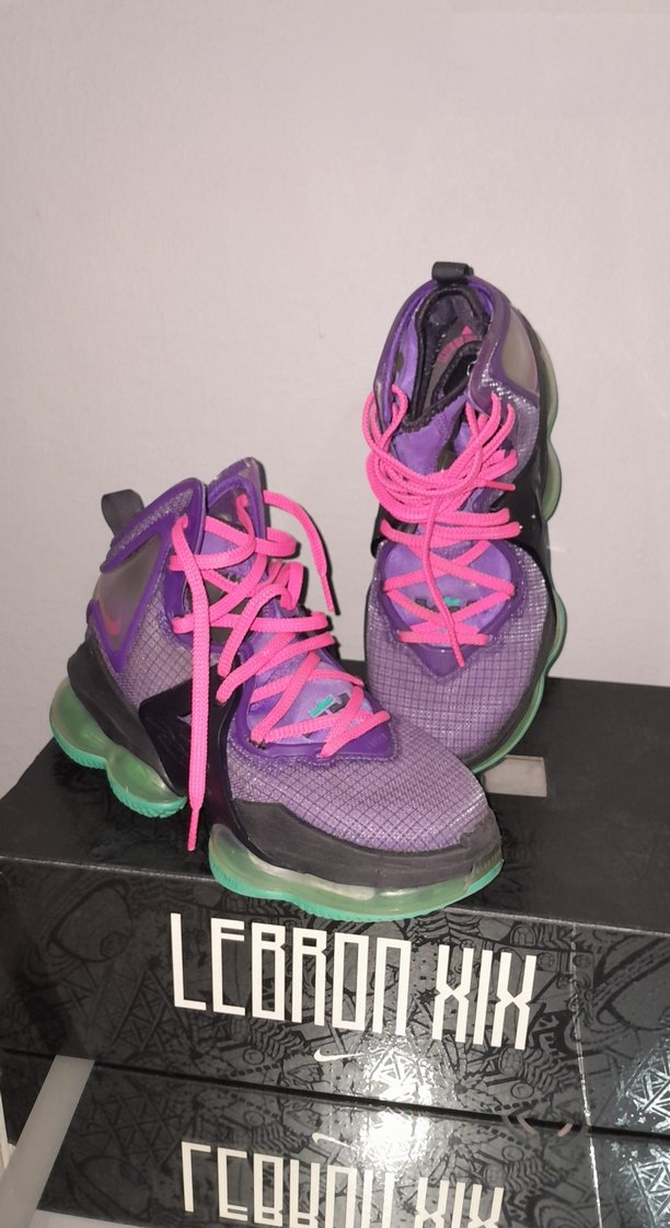 Koyu mor renkli, pembe bağcıklı ve baskılı detaylara sahip basketbol ayakkabısı. Kauçuk tabanlı, spor ve sokak stili için uygun. 37.5 numarasıdır 38 diye giris yaptım bilginiz olsun.