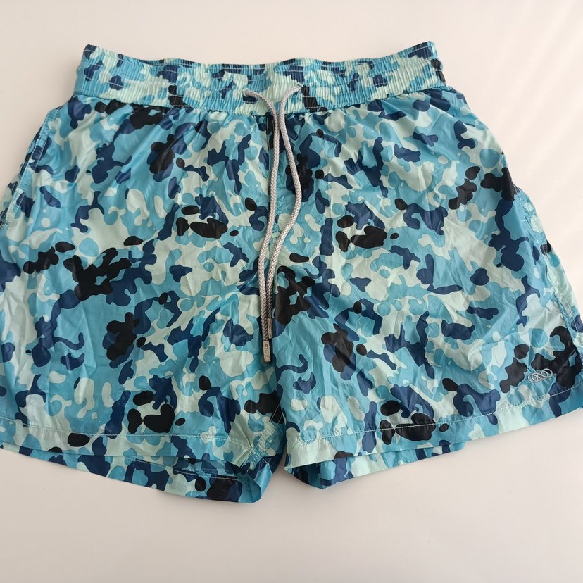 Mavi kamuflaj desenli, bol kesim erkek mayo .ayarlanabilir bağcıklı bel ile renkli ve rahat bir dış mekan tarzı sunar. çok iyi durumda kusuru yoktur.