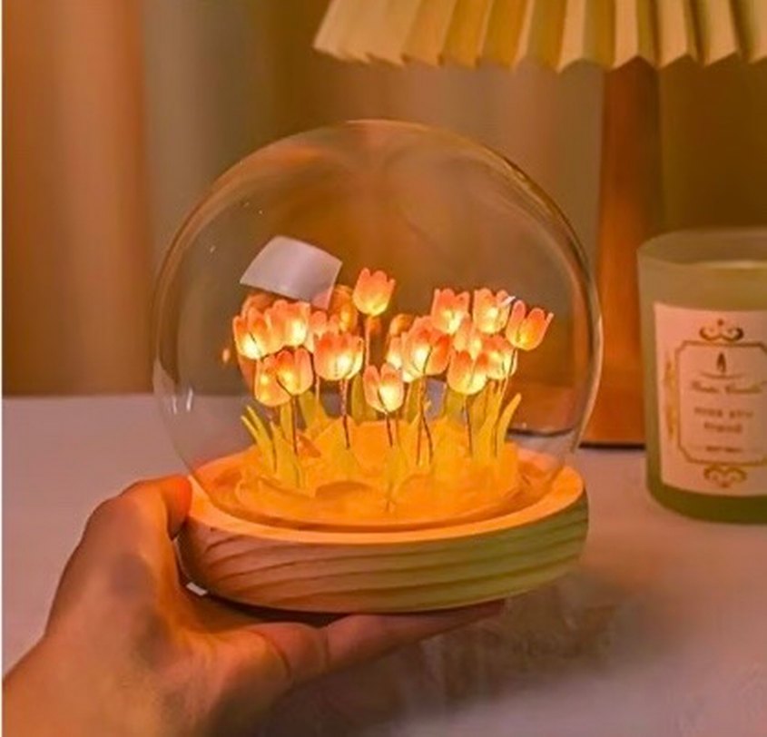 Led Işıklı Lale Cam Fanus – Ahşap Tabanlı Dekoratif Gece Lambası Renkli Işıklı Romantik Lale Küre