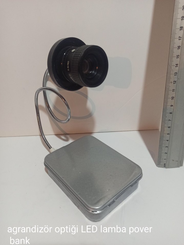LED Lambalı Agrandizör Optiği, esnek kollu ve ayarlanabilir lensli LED lamba. Yakın aydınlatma için uygun, sağlam tabanlı. pover bank şarjlı seyyar lamba