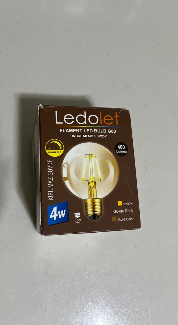 Kırılmaz gövdeli Ledolet filament LED ampul, 4W güç, E27 duy, 400 lümen, 2200K sıcak ışık rengi ve altın renk gövde. Hiç kullanılmadı