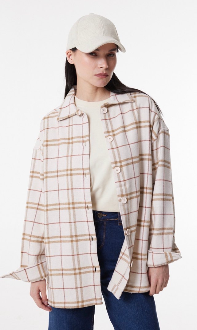 Pamuklu, bej renkli, uzun kollu ve düğmeli oversize gömlek. Hafif ekose desenli, günlük kullanıma uygun.