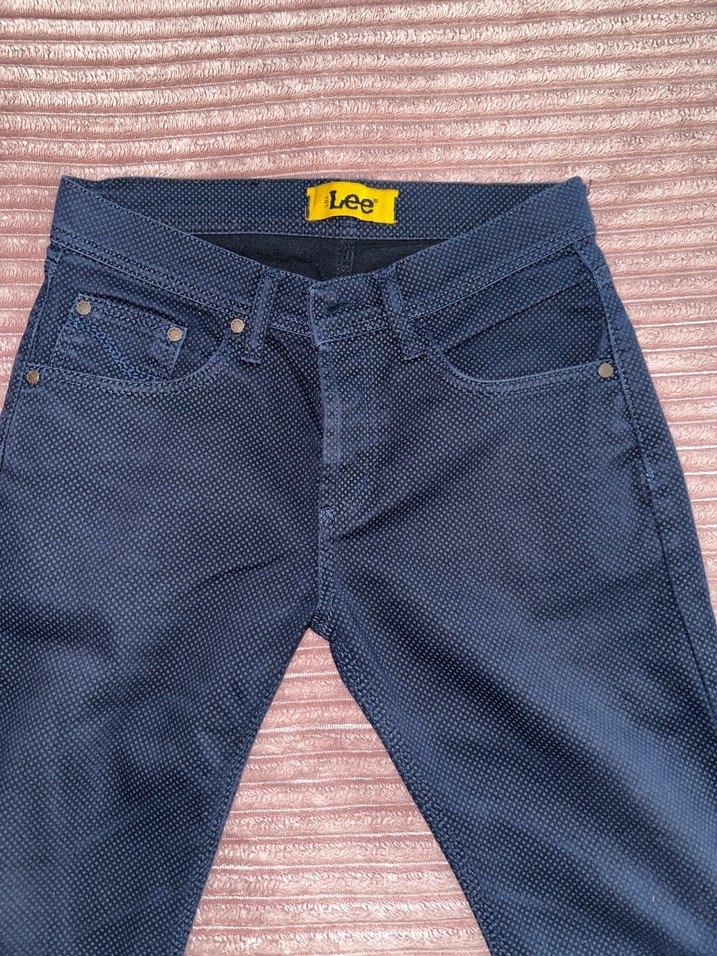 Lee markalı, baskılı desenli , normal boyda mavi kadın kot pantolon. Günlük sokak stili için uygundur.