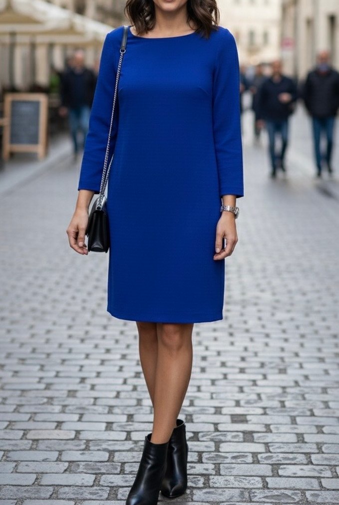 Lefon marka, lacivert renk elbise 38 beden. İki kol altı arası önden 44 cm, uzunluk 83 cm. Sorunsuz