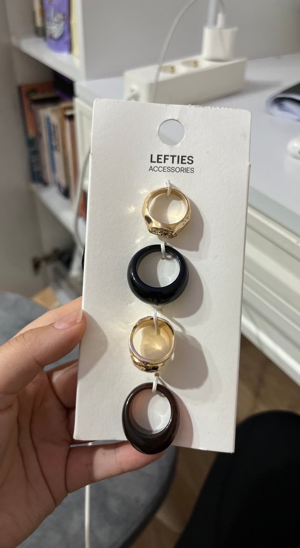 Tokalı detaylara sahip mini altın renkli yüzük seti koyu tonlarda baskılı desen içerir. Günlük sokak stiline uygun Paris tarzı. LEFTIES Accessories seti. Ürün sıfır aldığın fiyatı koydum ona gore fiyat koyacagım