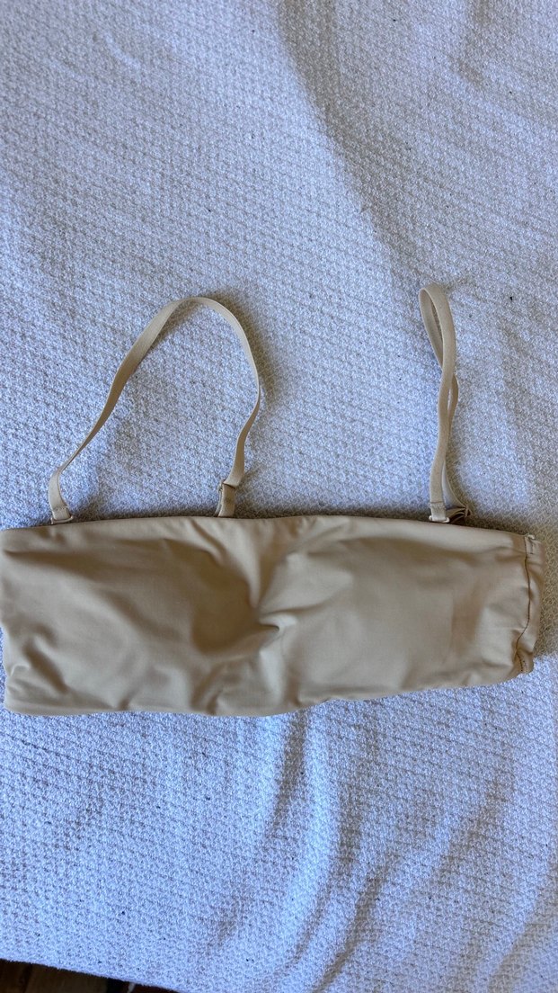 Açık bej renkli, vücuda oturan Ayarlanabilir askıları ve desensiz, rahat kumaşı vardır. Çıkabiliyor askısı