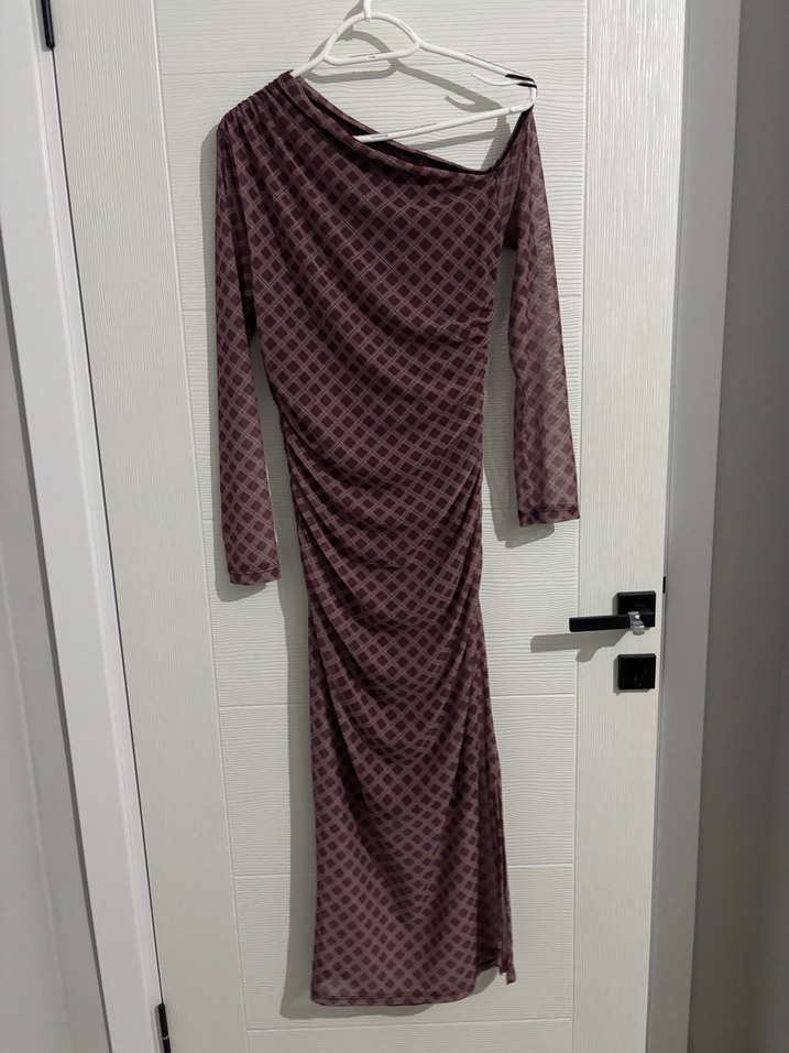 Bordo tonlarda, drapeli ve tek omuzlu uzun elbise. Tekstilinde yumuşak sentetik kumaş kullanılmıştır, romantik akşamlar için uygundur. Hiç giyinmedim yeni etiket mevcut değil herhangi bir kusuru yok