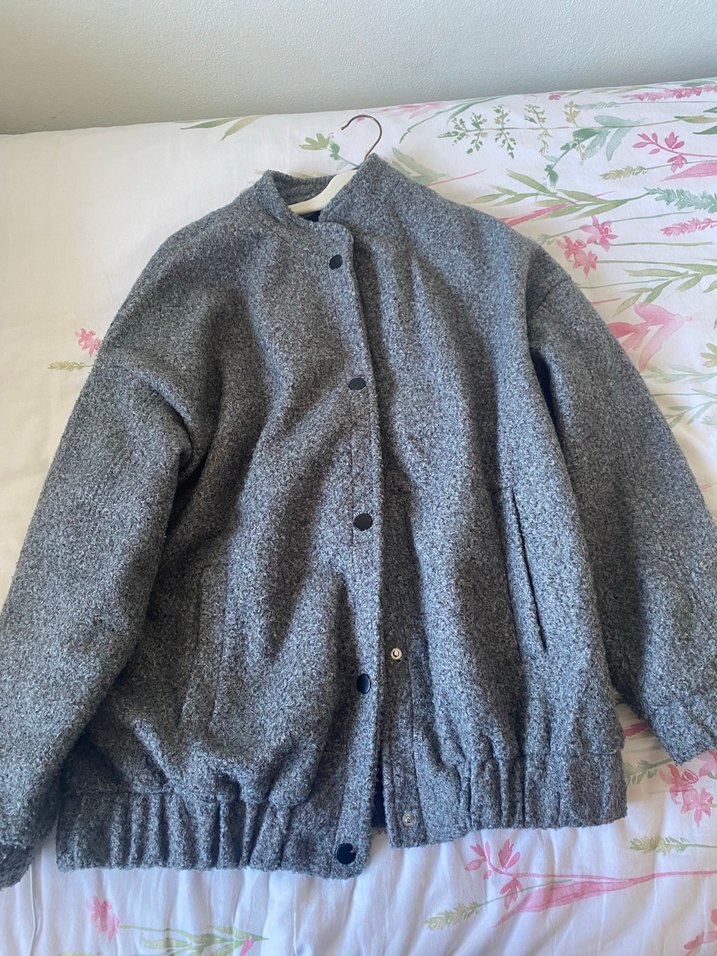 Gri yün ceketin düğmeli kapaması, uzun kolları ve normal midi boyu vardır. Rahat kesimi ve notlu yakasıyla günlük kullanıma uygundur.