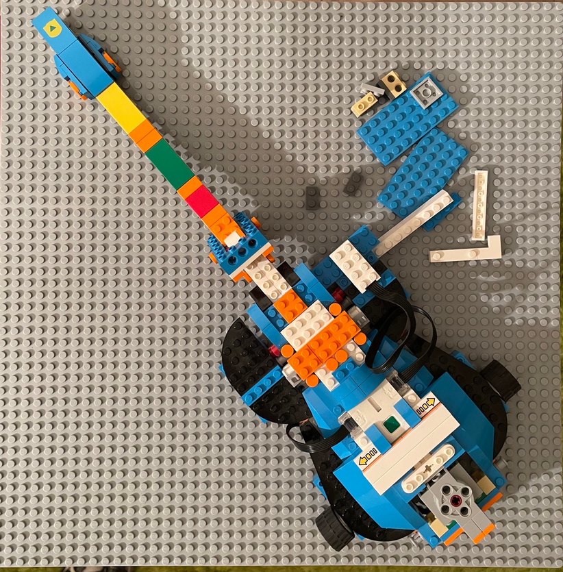 Uzun kollu, tekerlekli ve çeşitli renklerde bloklardan oluşan renkli mavi Lego robot seti.