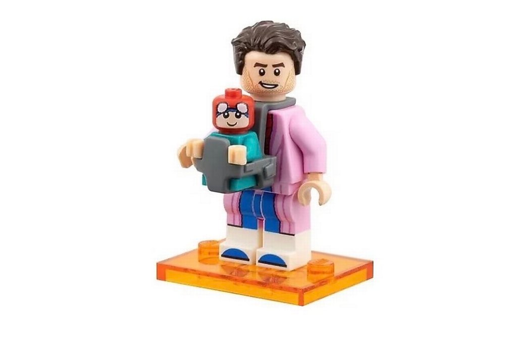 Bebek taşıyıcı içinde bebek tutan, detaylı yüz ifadeleri ve canlı renkli giysilere sahip renkli Lego figürü. Şeffaf turuncu kaide üzerinde duruyor.